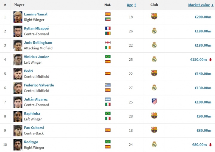 1, Yamal (Barcelona): 200 triệu euro