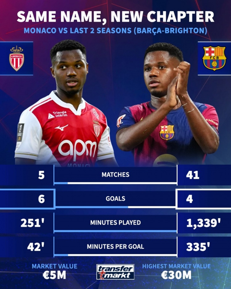 Fati đã tham gia Monaco theo mượn từ Barcelona vào mùa hè này. Thị trường chuyển nhượng Đức đã so sánh dữ liệu của FATI ở Barcelona và Brighton trong hai mùa qua, cũng như dữ liệu ở Monaco mùa này.