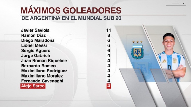 ESPN đã thống kê số bàn thắng mà các cầu thủ Argentina ghi được trong lịch sử Giải vô địch trẻ thế giới và liệt kê những cầu thủ Argentina ghi nhiều bàn thắng nhất trong lịch sử Giải vô địch trẻ thế giới. Saviola đứng đầu danh sách với 11 bàn, Maradona, Messi và Aguero ghi 6 bàn, còn Salco ghi 4 bàn ở giải đấu này. sáu bàn 4 bàn